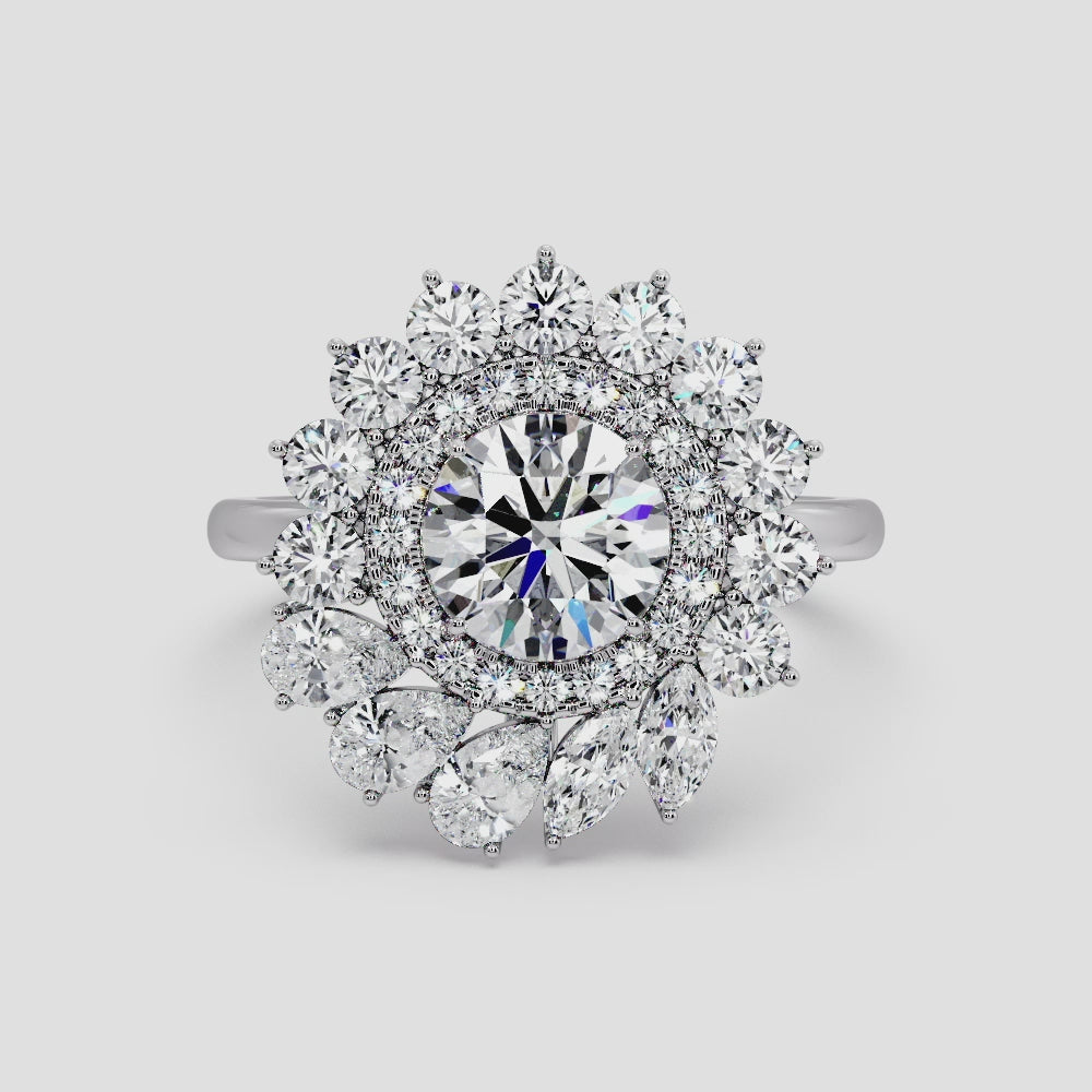 Gemnomads Signature Bridal Collection: Embellished with dazzling round brilliant, pear, and marquise diamonds, this stunning engagement ring with a floral halo of diamonds adds an instant dose of drama to everything in your wardrobe.
