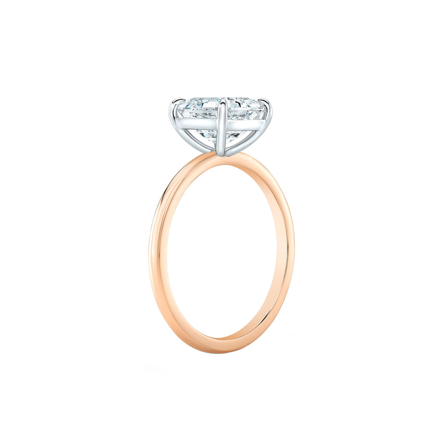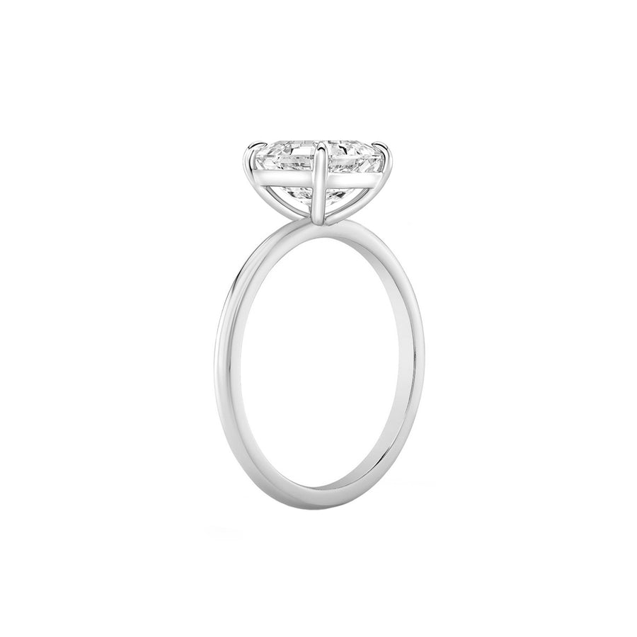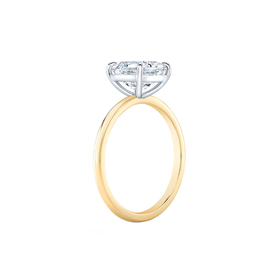This stunning solitaire engagement ring in basket setting is studded with certified lab grown diamond. Crafted in 14K solid gold. Total Carat weight: 5.00 carats. Diamond size approximately: 13-14 mm x 9.5-9.8 mm. Focal stone clarity options: VVS2. Focal stone color: F. Customizable in metals of choice. Band width: 2 mm. Prongs crafted in white gold. Designed in Austin, Texas.