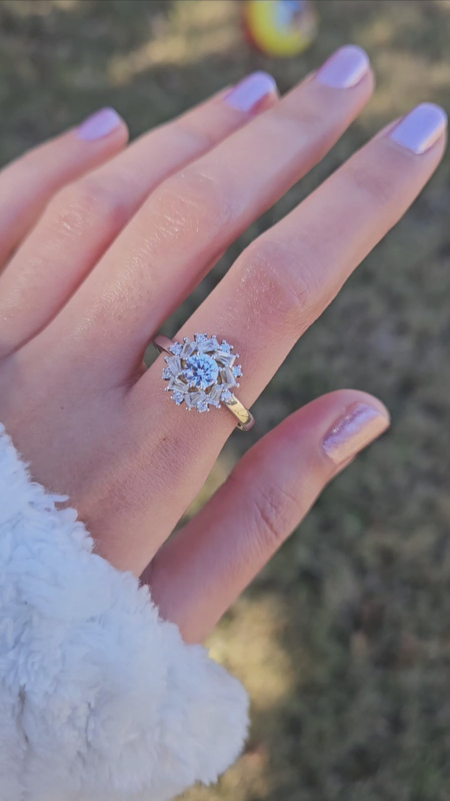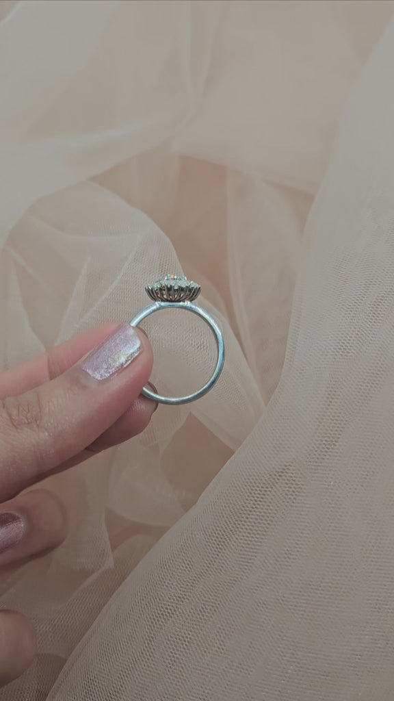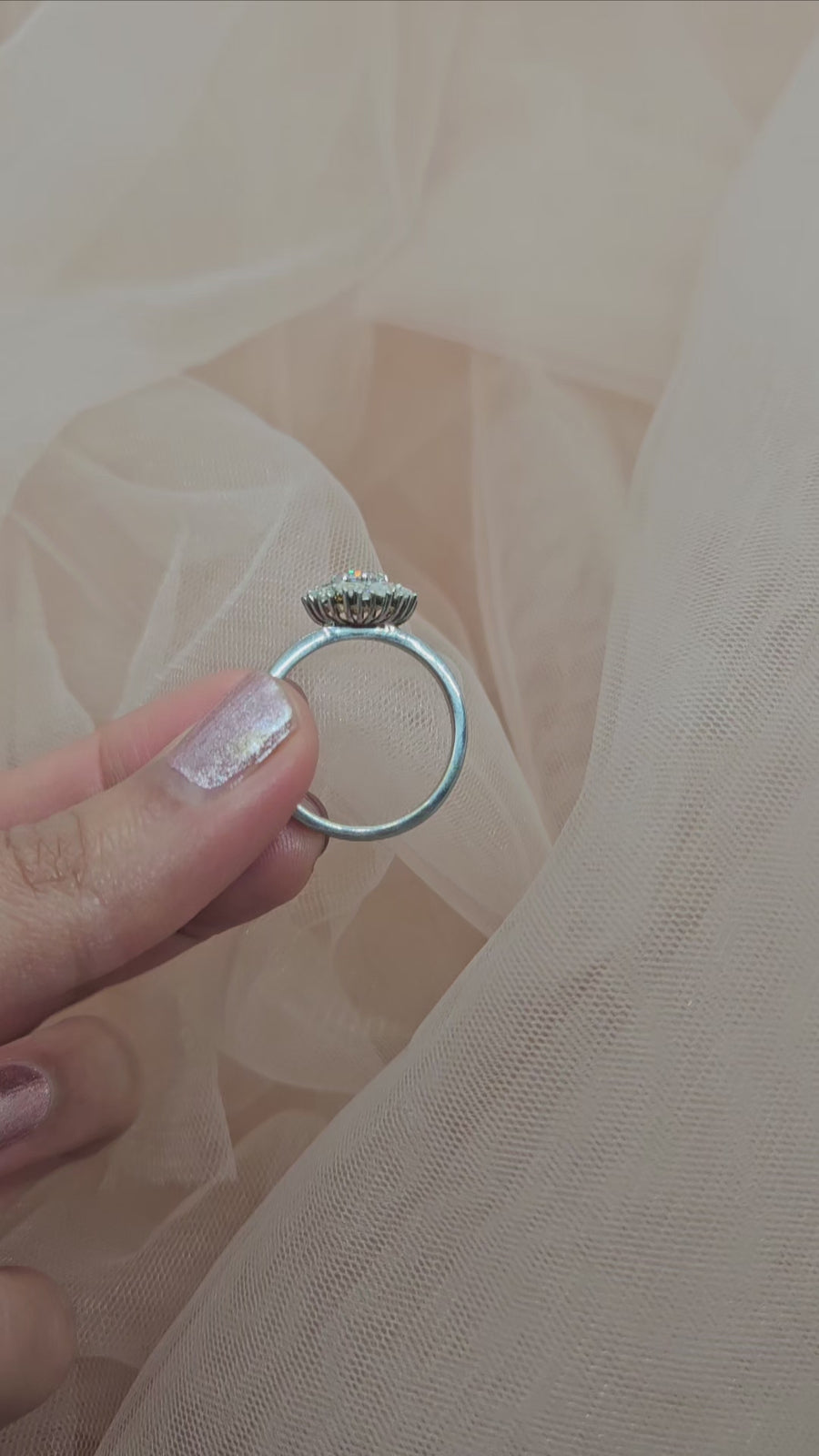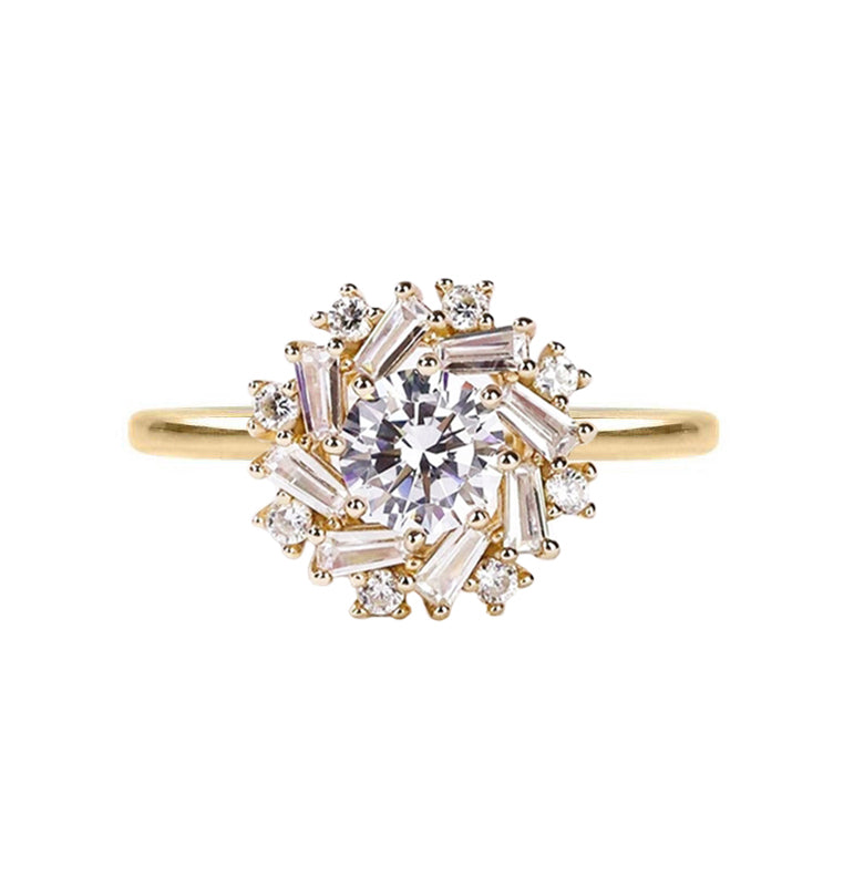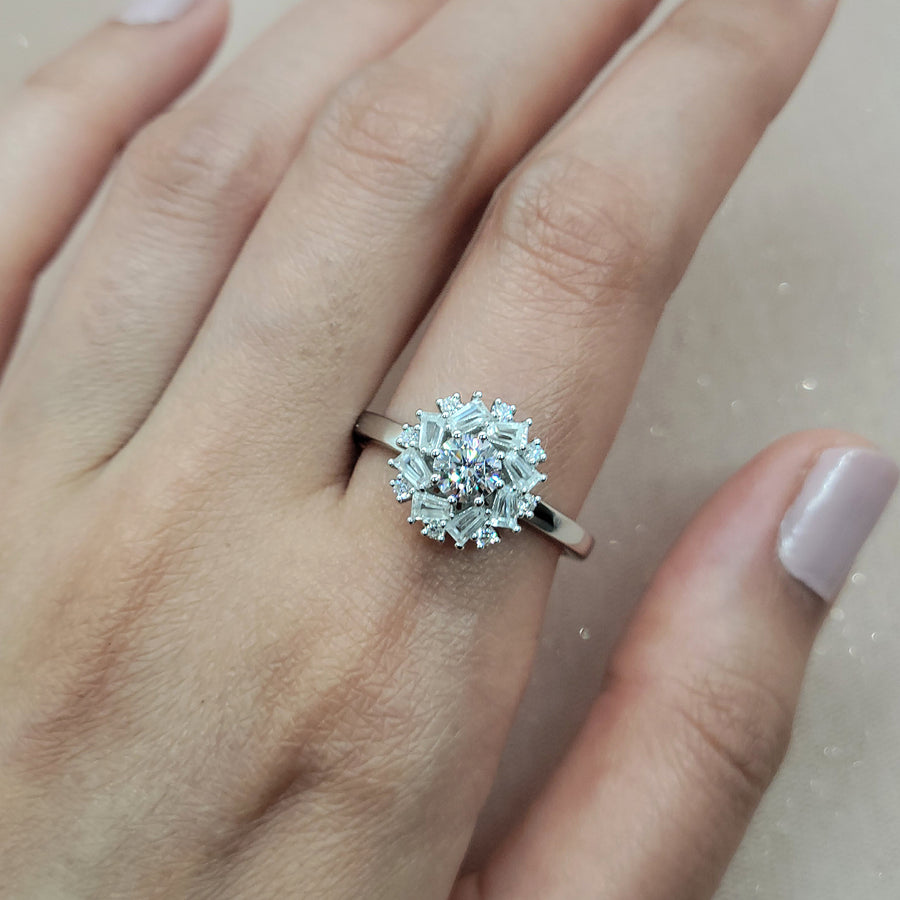 Gemnomads Bridal Collection: Embellished with dazzling round and baguette diamonds, this gorgeous engagement ring with a stunning floral halo, adds an instant dose of drama to everything in your wardrobe.