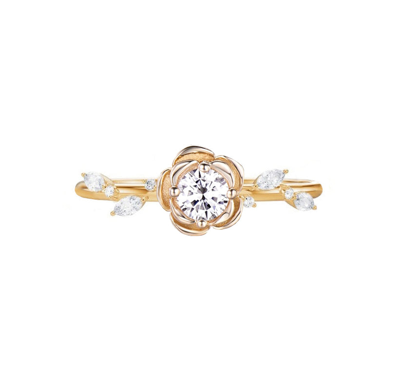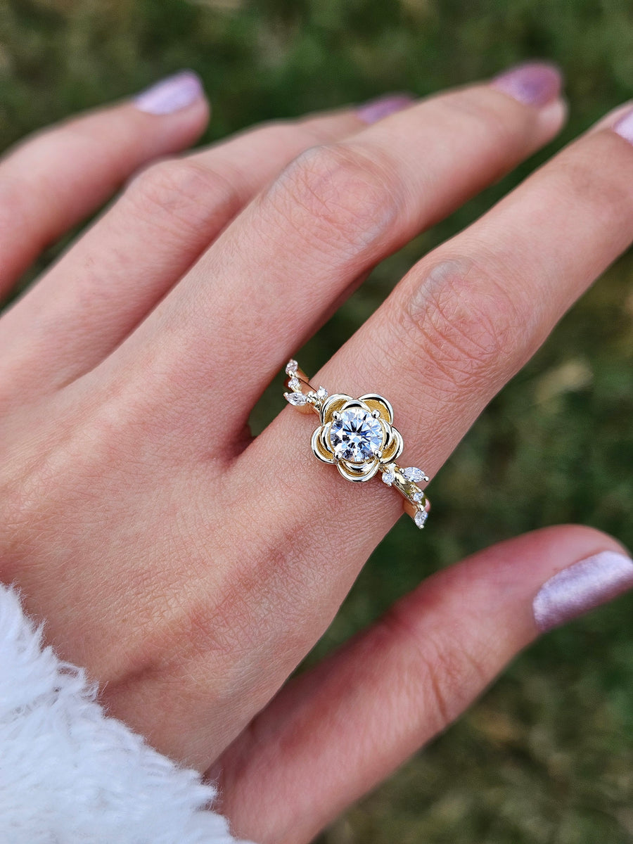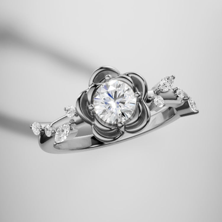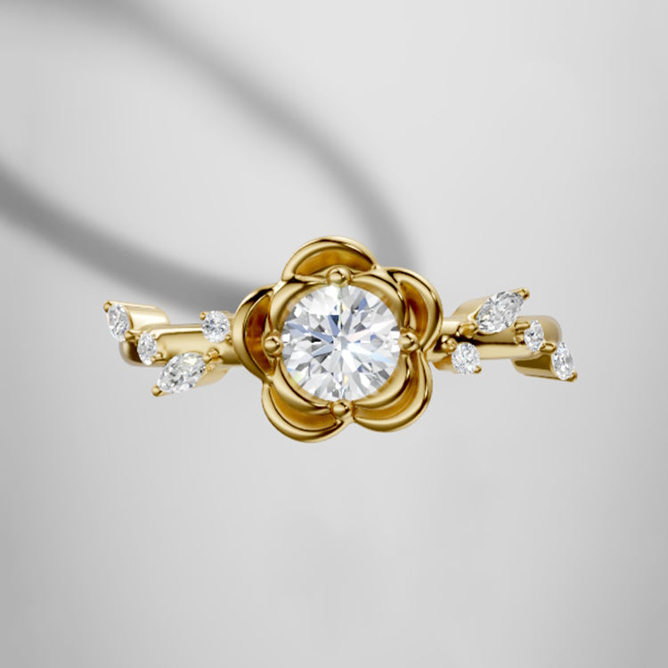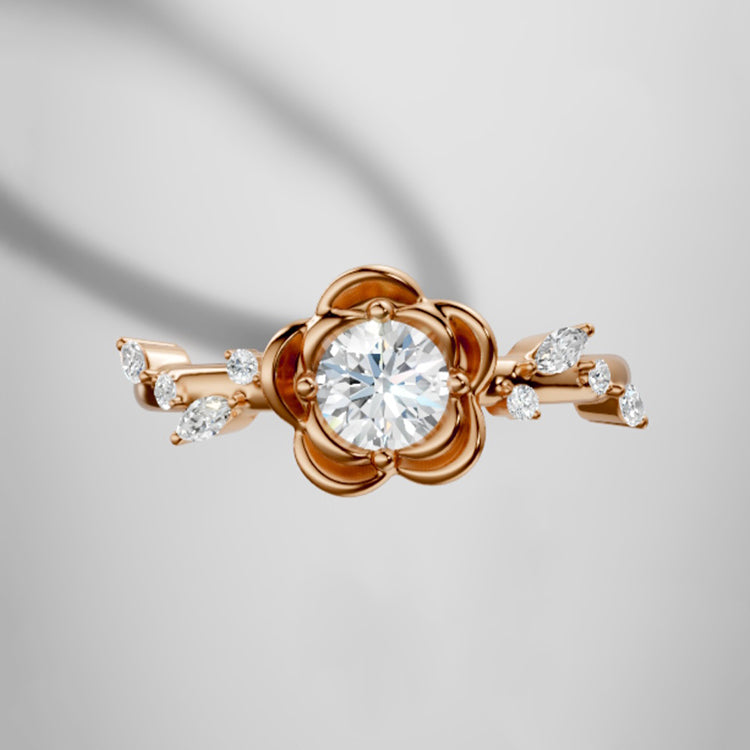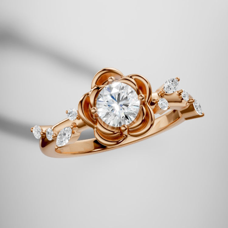 Rose Flower Round Lab Grown Diamond Engagement Ring in 18K Gold